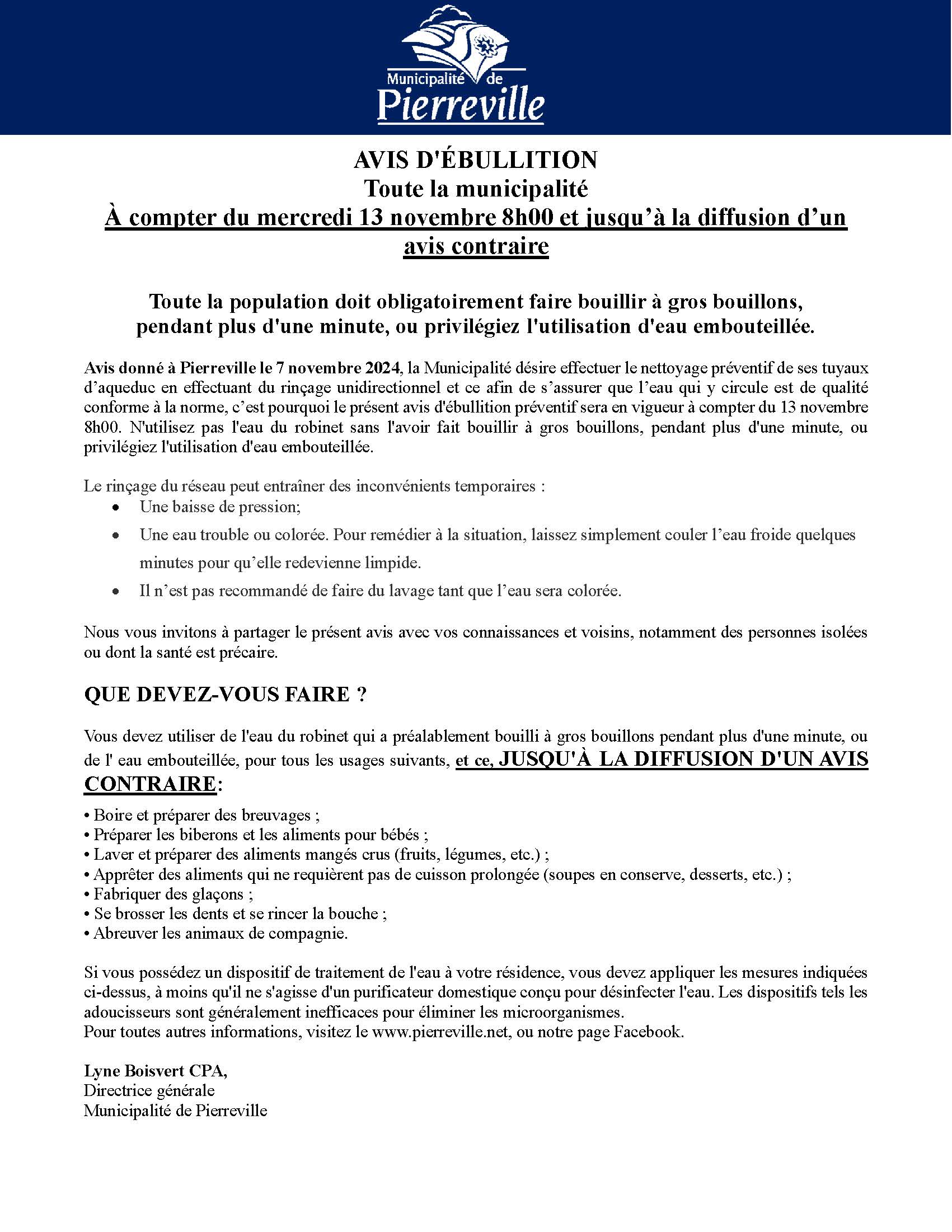 La Municipalité de Pierreville vous informe de l'avis d'ébullition de l'eau potable en vigueur dès maintenant, soit le mercredi 13 novembre 2024 - 8h00. Toute la population de Pierreville doit obligatoirement faire bouillir à gros bouillons, pendant plus d'une minute, ou privilégier l'utilisation d'eau embouteillée.